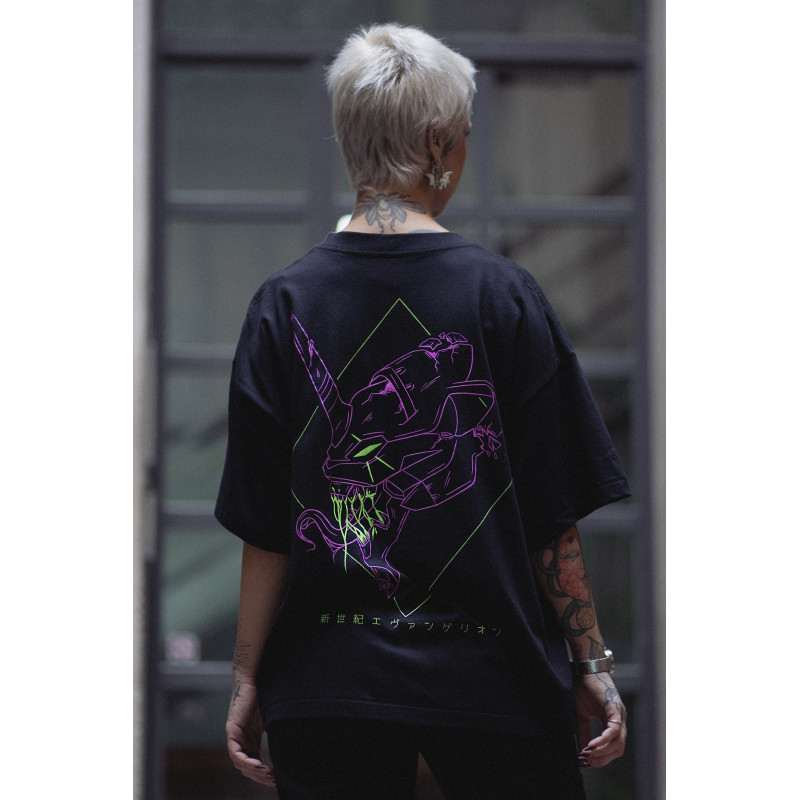 Camiseta negra oversize diseño EVA 01 inspirado en el personaje EVA 01 del anime Evangelion.